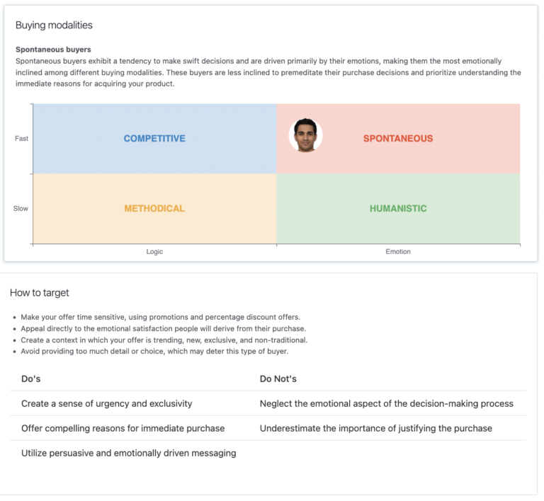 Another useful feature of the Buyer Persona report is the Buying Modalities matrix and the How to Target strategy. This section will equip you with a 360° view of your audience and actionable insights on how to engage them effectively.